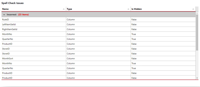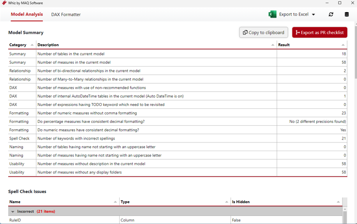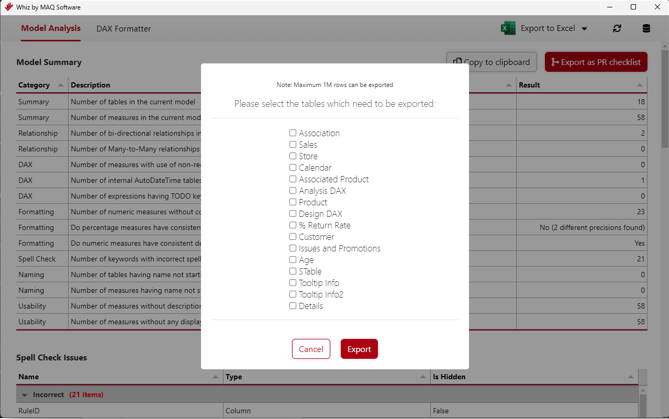 - Spell Check – Identify possible spelling mistakes in table, column, and measure names