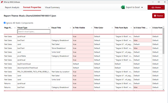 - Format Properties page will extract format properties for the default Power BI visuals only (out of the box visuals).
