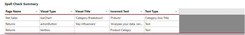 - Spell Check – Identify possible spelling mistakes in common components directly visible to end users (Visual Title, Axis Title, Button Text, and Textbox content)