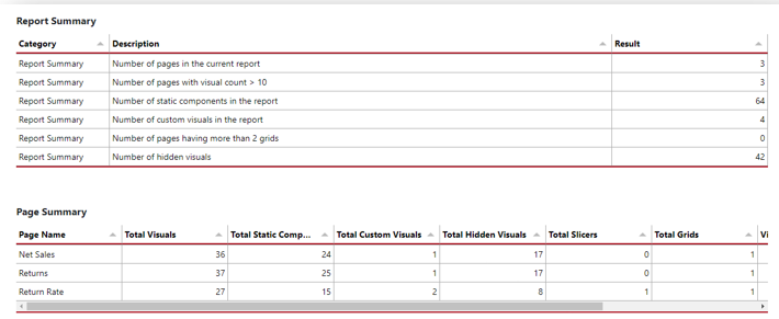 Provides a summary of the pages, visuals, and other visual components