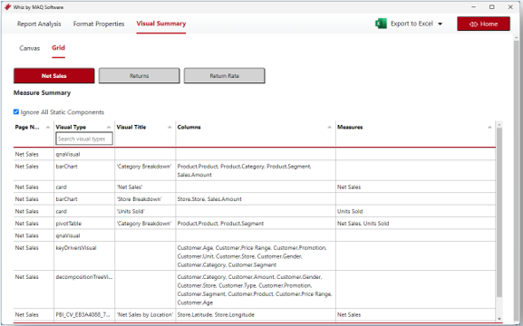 - Visual Summary – Document columns and measures used for each visual of the report